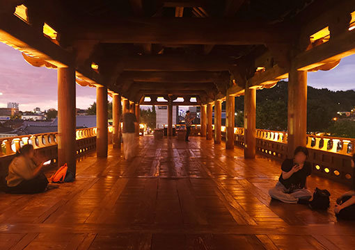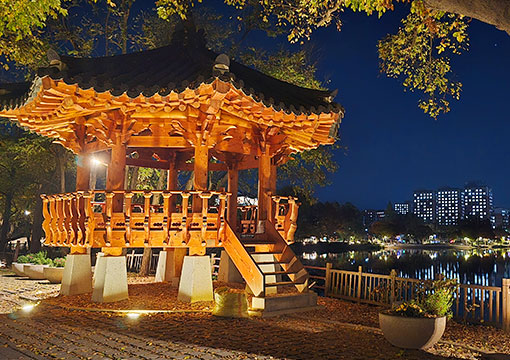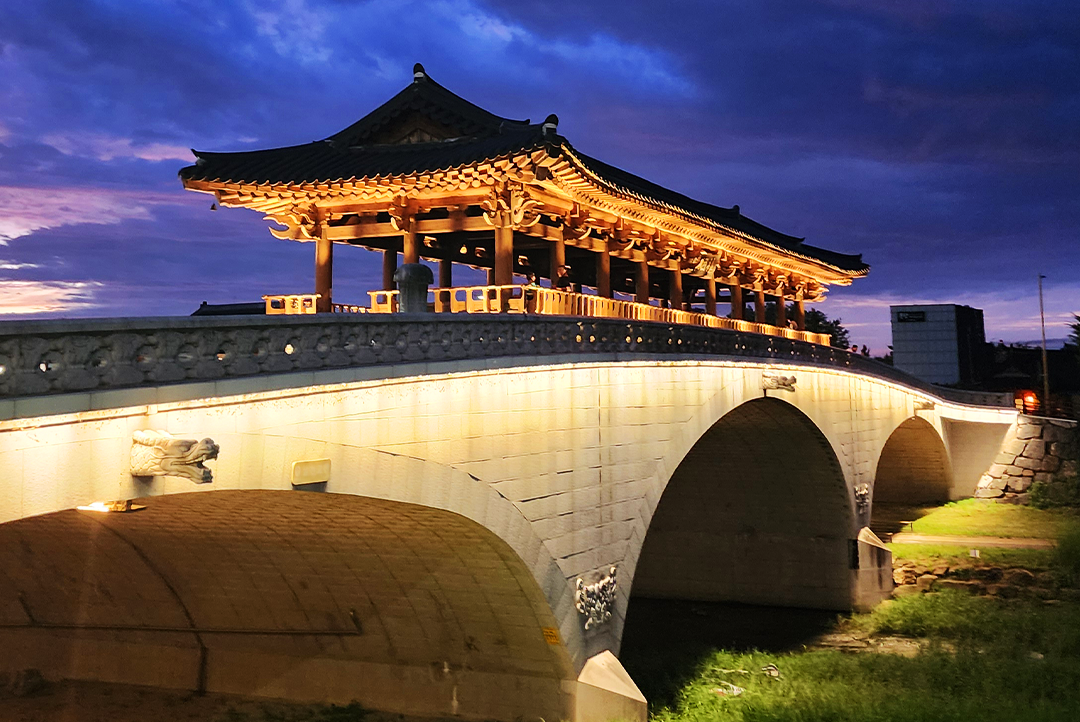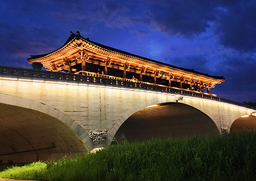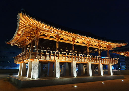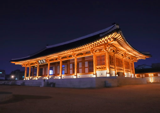 청연루에 비친 전주천의 잔물결을 눈에 담아보자. 전주의 유산은 밤이 되면 더 아름답게 살아난다.