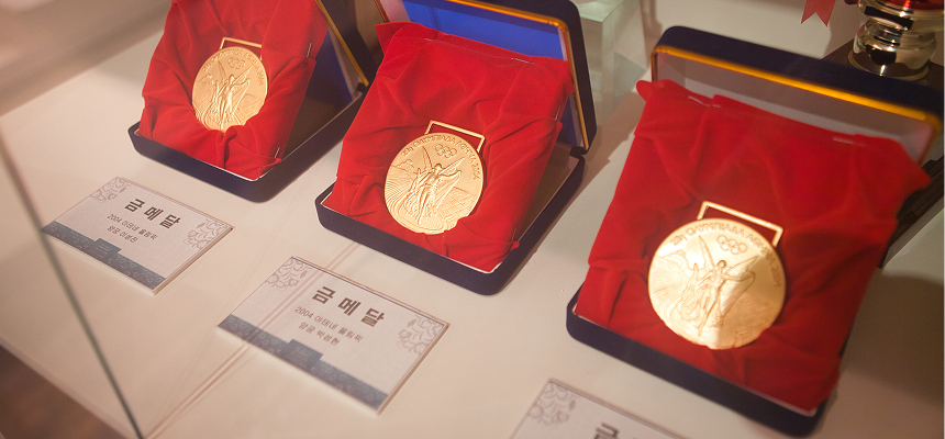 这里展出了“神弓”朴成贤教练在世界之巅摘得的真实金牌与箭矢,让人切实感受到韩国射箭压倒性的地位。