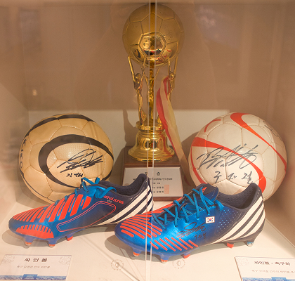 以及韩国足球象征性人物具滋哲捐赠的亲笔签名球鞋和足球,